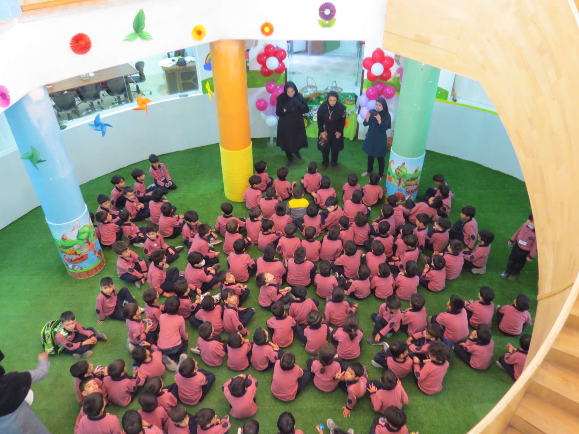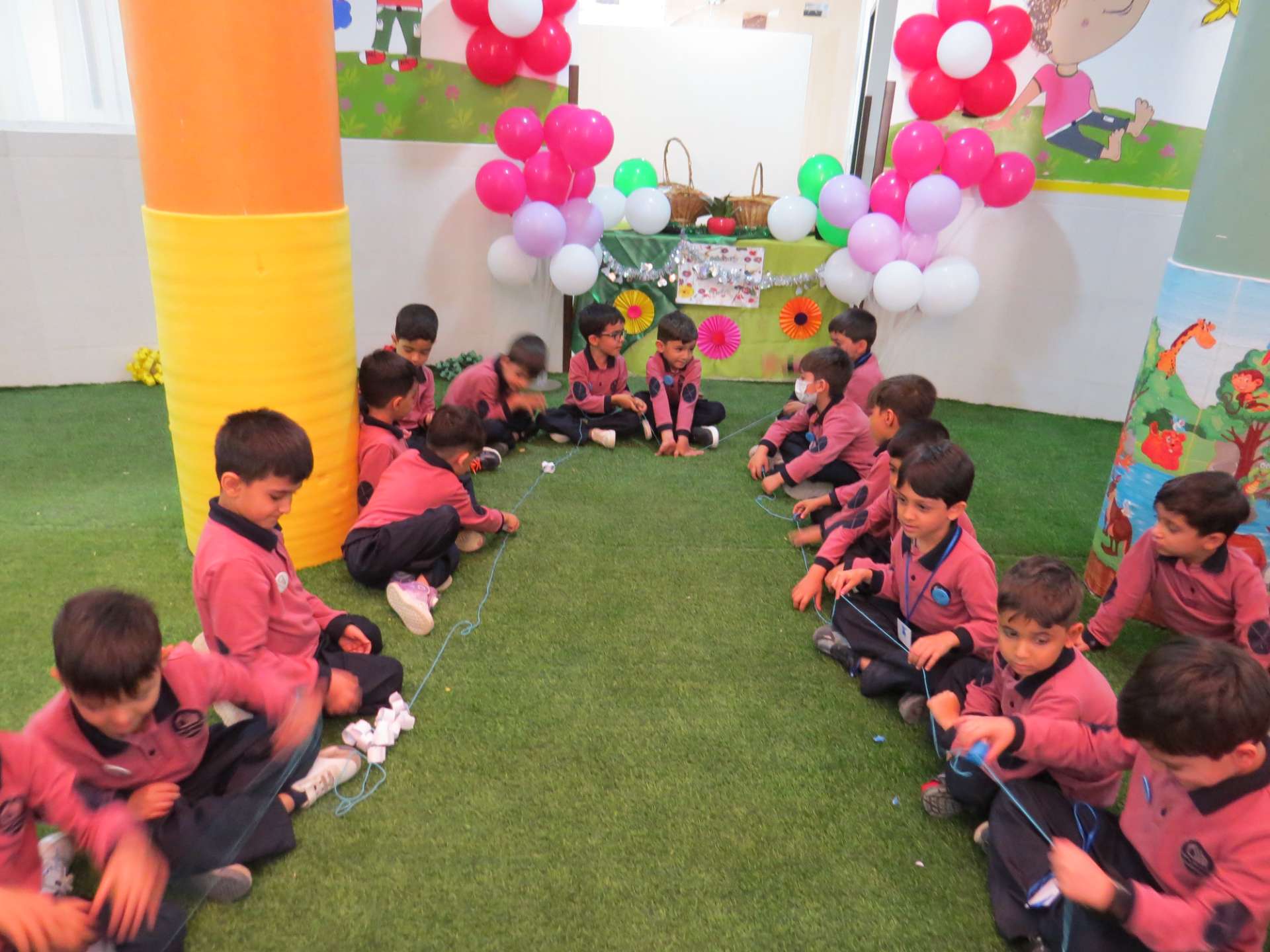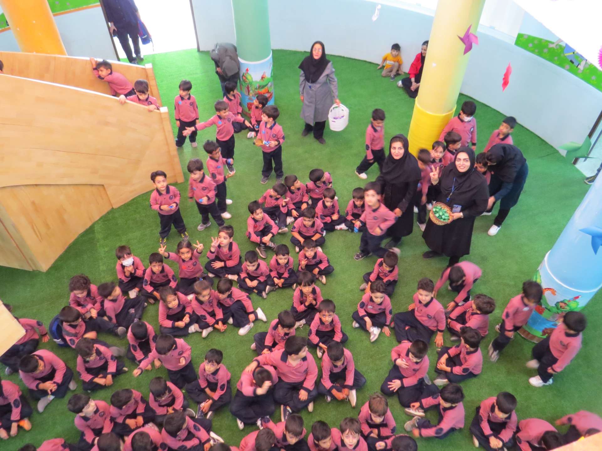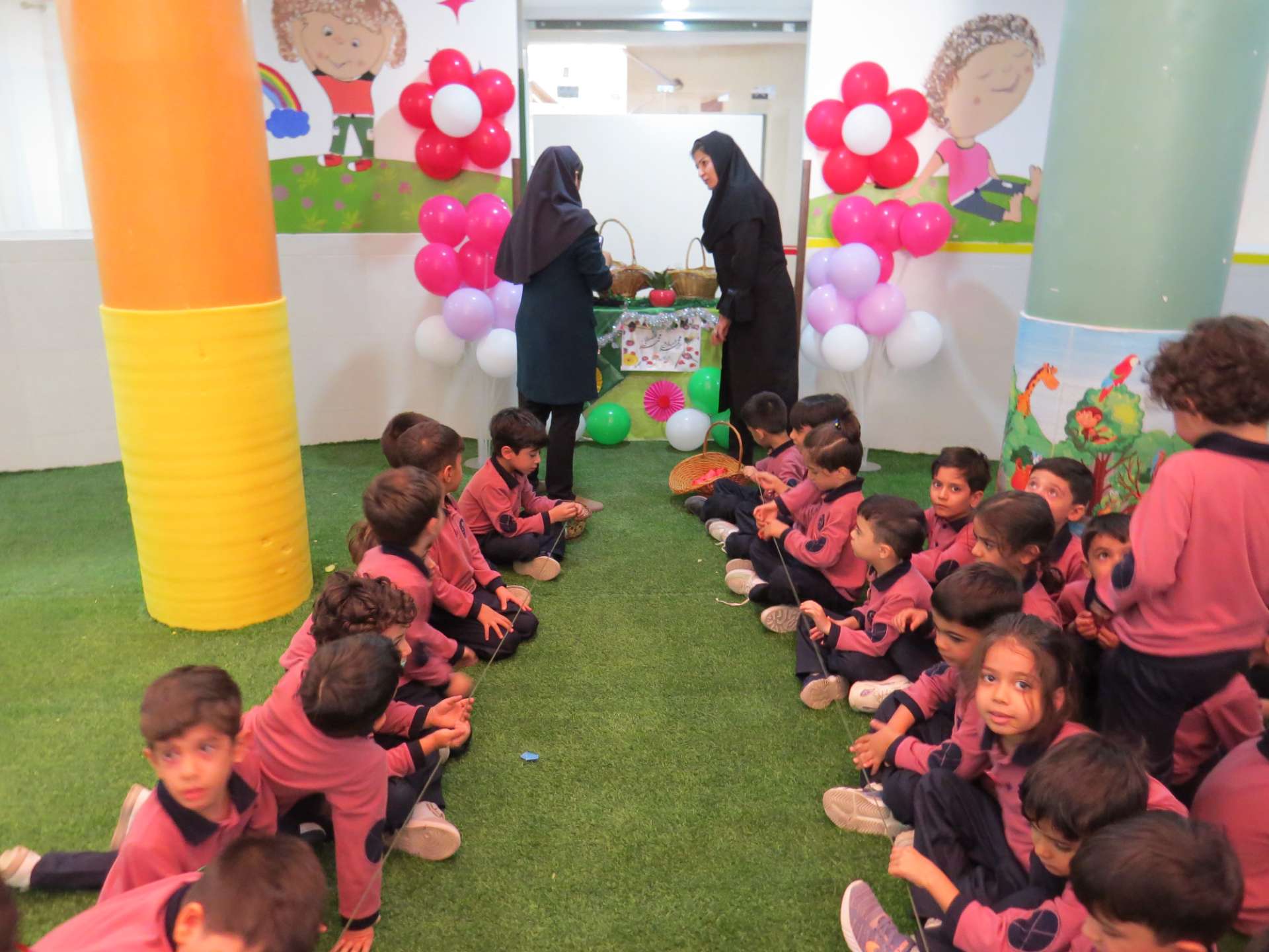 نوآموزان حلقه هایی به رنگ کلاس خود درست کردند و دو کلاس و سه کلاس با هم به صورت مسابقه حلقه ها را داخل یک نخ کردند و حلقه ها را به هم رساندند.مثلا کلاس شادی حلقه های قرمز را داخل نخ کردند و کلاس کوشا که حلقه های سبز داشتند را به هم رساندند و به این صورت کلاس ها پیمان وحدت با هم بستند. در آخر داخل کلاسها با بسته های شکلات پذیرایی شدند