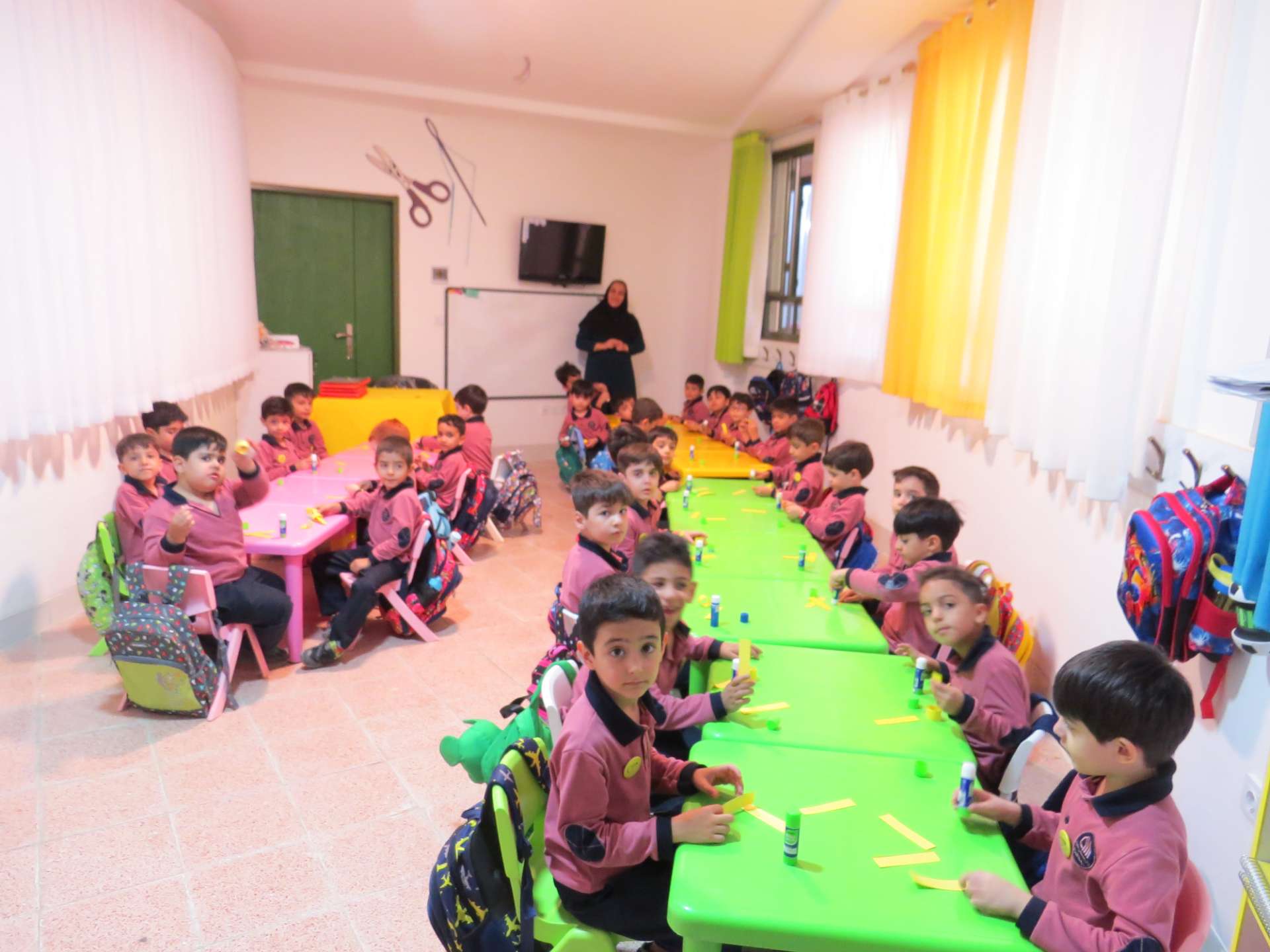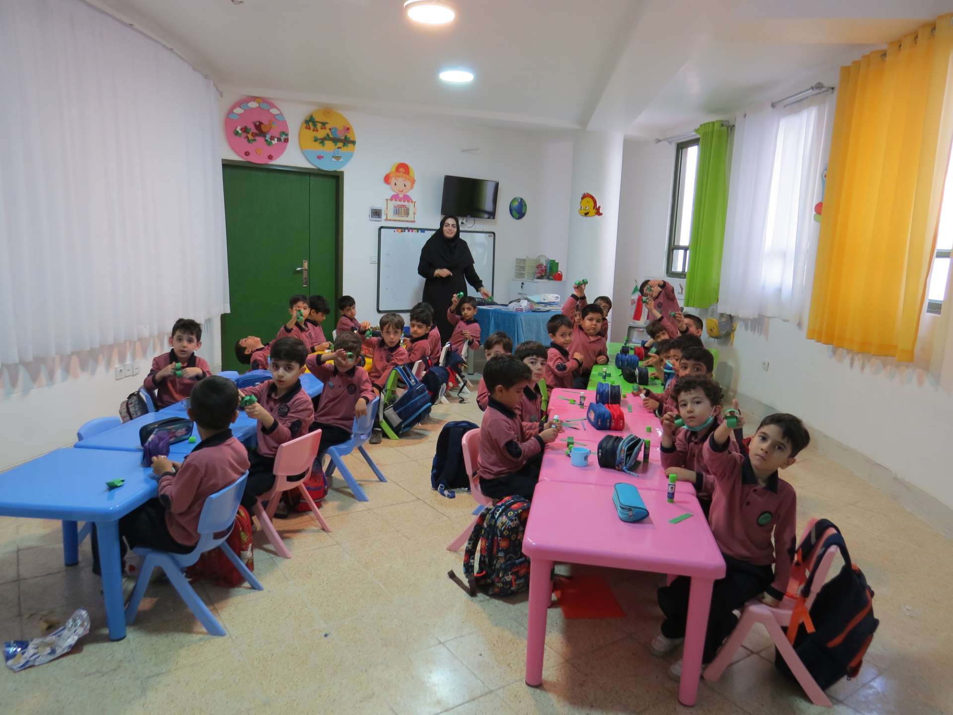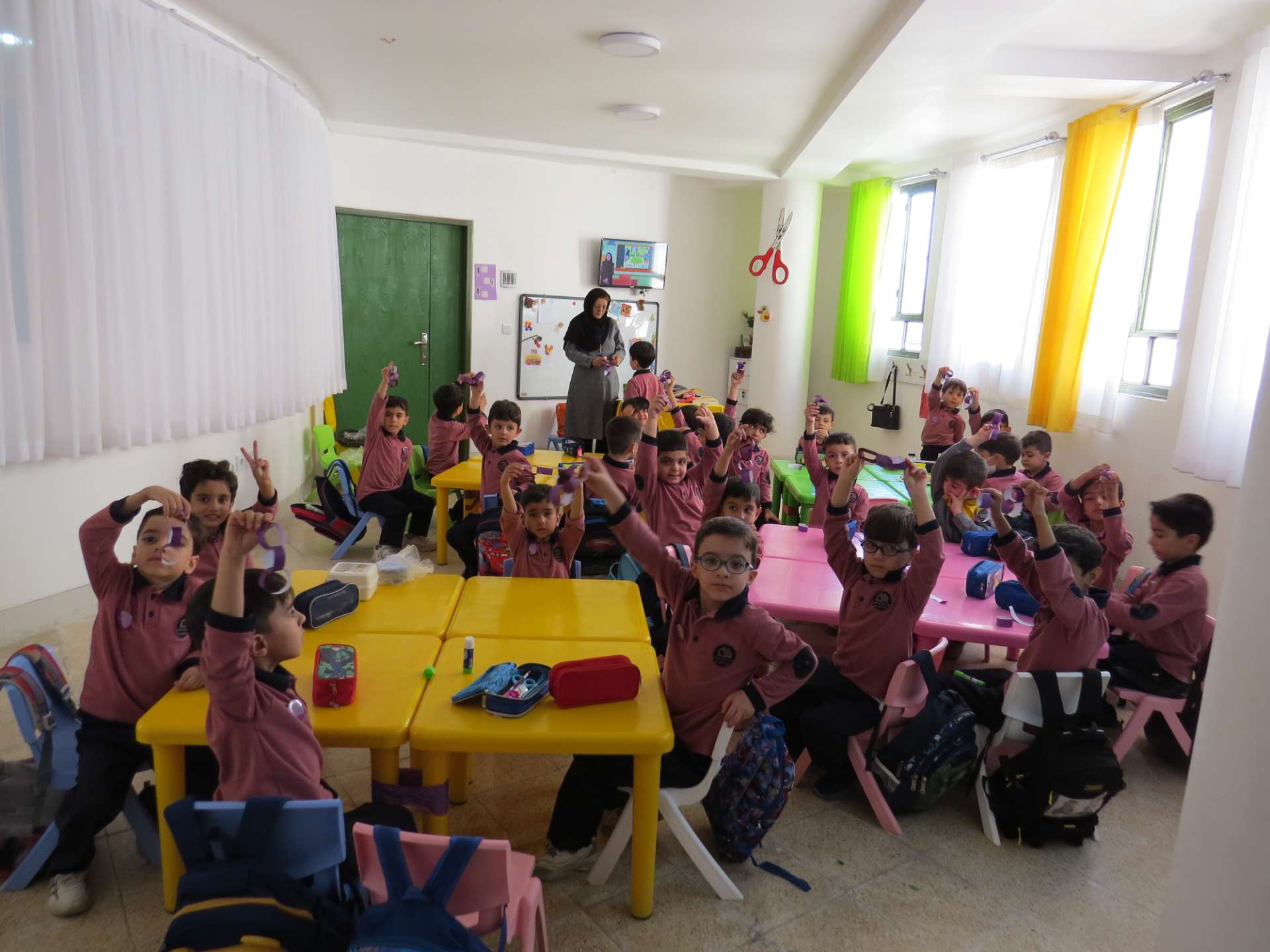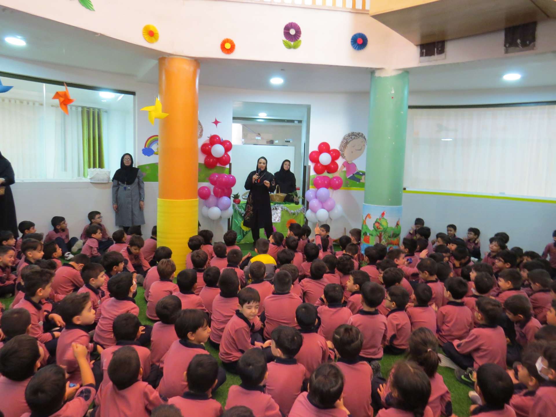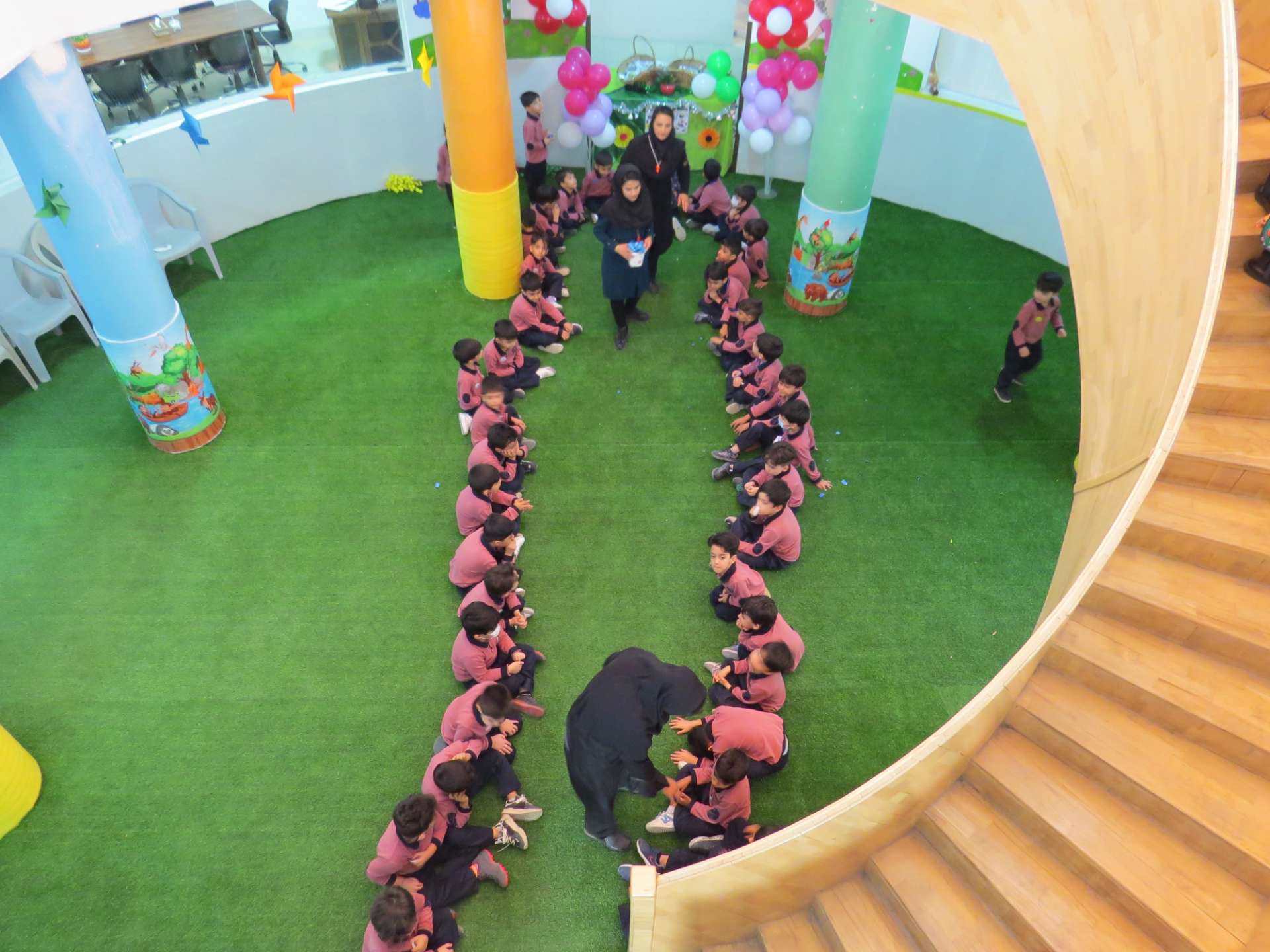 نوآموزان حلقه هایی به رنگ کلاس خود درست کردند و دو کلاس و سه کلاس با هم به صورت مسابقه حلقه ها را داخل یک نخ کردند و حلقه ها را به هم رساندند.مثلا کلاس شادی حلقه های قرمز را داخل نخ کردند و کلاس کوشا که حلقه های سبز داشتند را به هم رساندند و به این صورت کلاس ها پیمان وحدت با هم بستند. در آخر داخل کلاسها با بسته های شکلات پذیرایی شدند