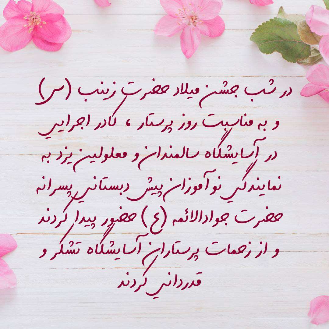 در تاریخ 27 آبان در شب جشن میلاد حضرت زینب (س ) و به مناسبت روز پرستار ، کادر اجرایی در آسایشگاه سالمندان و معلولین یزد به نمایندگی نوآموزان پیش دبستانی پسرانه حضرت جوادالائمه (ع) ناحیه دو حضور پیدا کردند و از زحمات پرستاران آسایشگاه تشکر و قدردانی کردند سپس در تاریخ 28 آبان به مناسبت این روز عزیز پیش دبستانی پسرانه میزبان سه نفر از والدینی که شغل پرستار داشتن بود و بعد از سخنرانی این عزیزان و مصاحبه با آنها به منظور قدردانی از زحمات این قشر زحمتکش هدیه ای بابت یادبود به ایشان تقدیم گردید