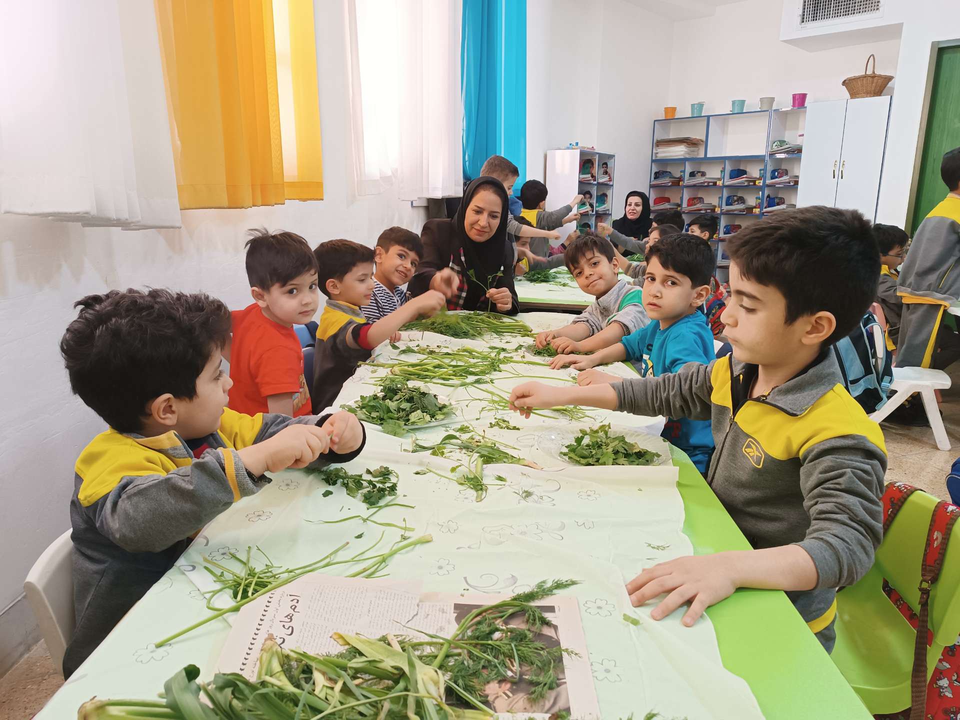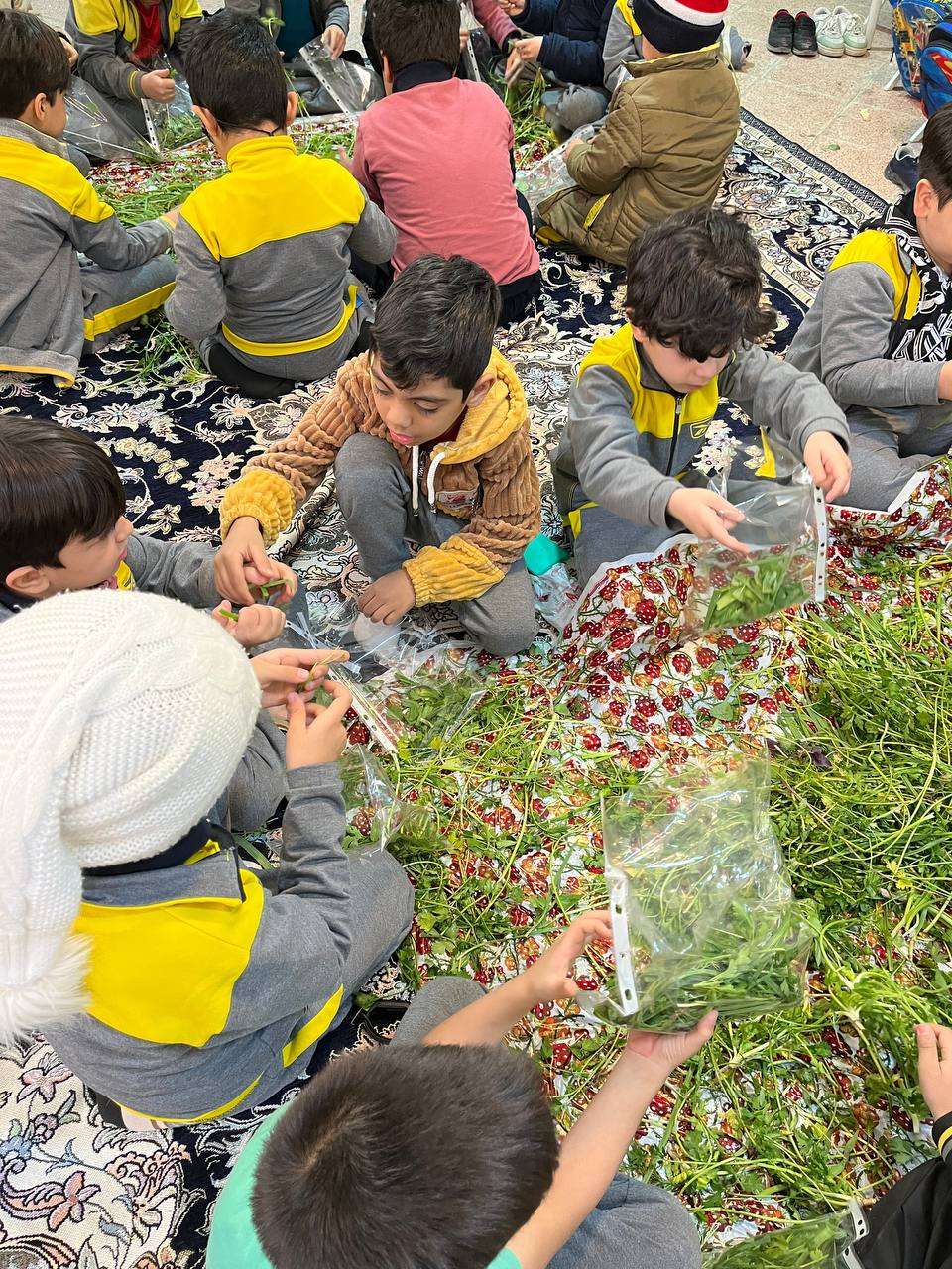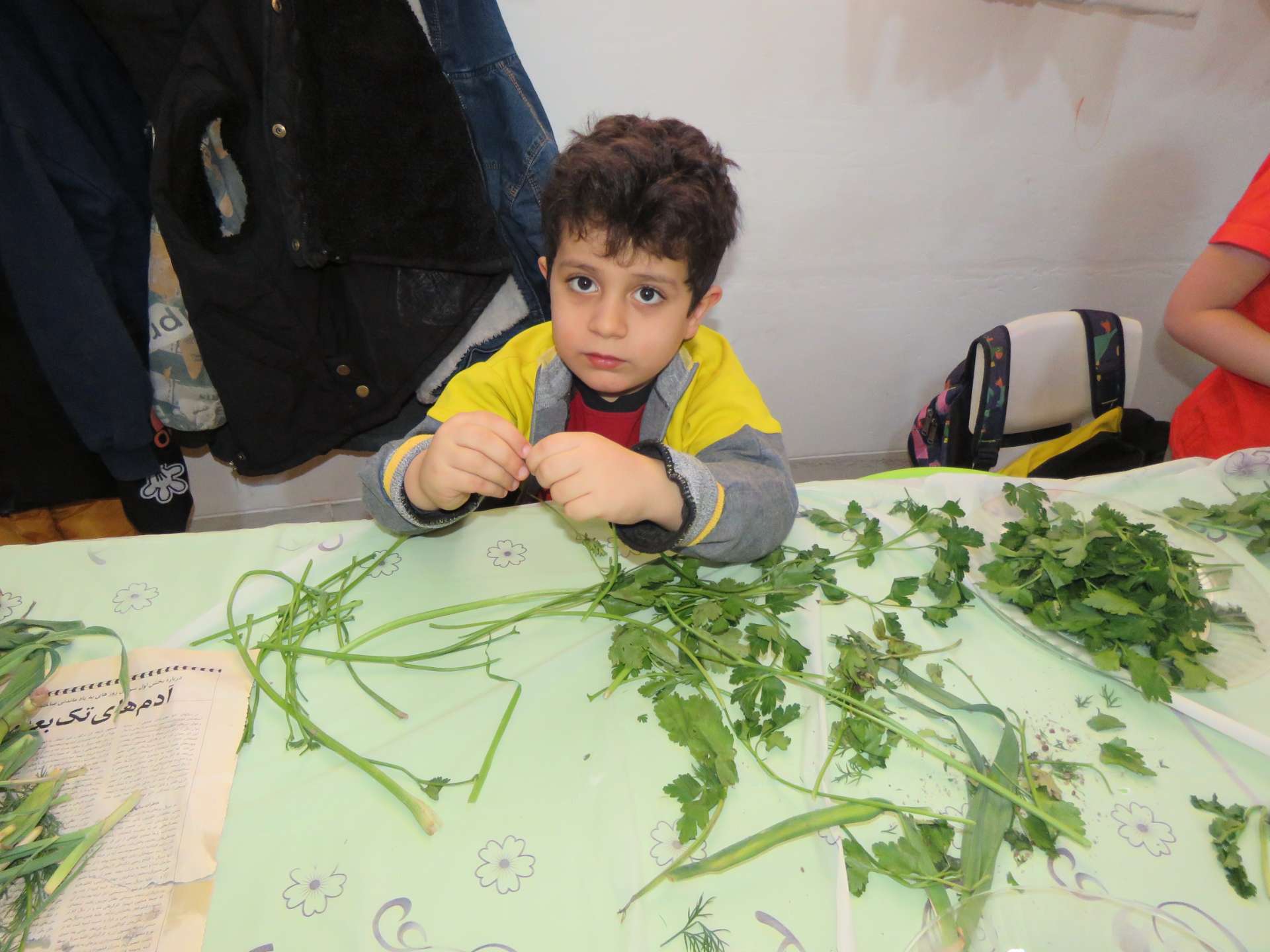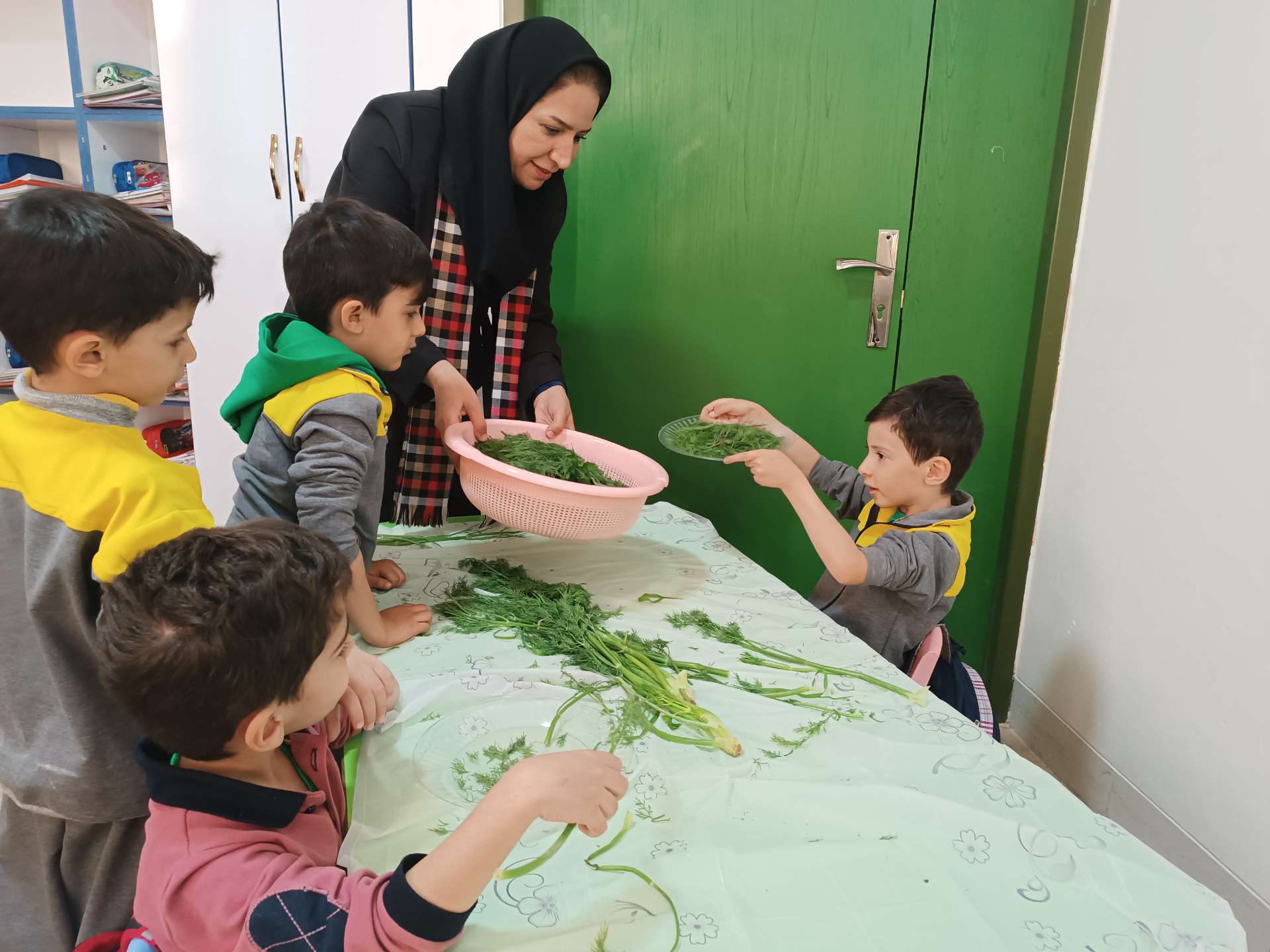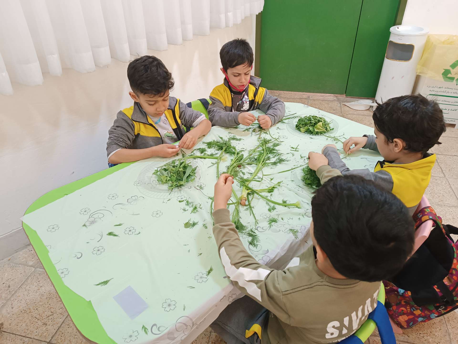 4 - آشنایی نوآموزان با شغل سبزی فروشی (دست ورزی و مهارت زندگی) و بسته بندی ، نوآموزان سبزی خوردن را پاک کردن و مراحل شست و شو و ضدعفونی سبزی آشنا شده و در نهایت نان و پنیر و سبزی کنار مربی و همکلاسی های خود نوش جان کردند